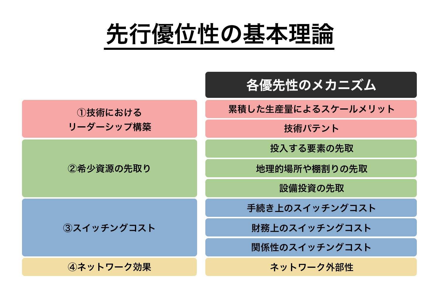 今回は、そんな「先行優位性」という言葉がもたらす「思い込みの罠」を回避するためにはどのような発想を持つべきかについて、アカデミックな観点と実際の事例を用いながら紹介していきます。そもそも、「先行優位性」とは何なのでしょうか。「先行優位性」の理論として有名な論文の1つに、Leberman and Montgomery(1988)の「First Mover Advantages」がありますが、この論文は以下の4つの「先行優位性」を指摘しています。