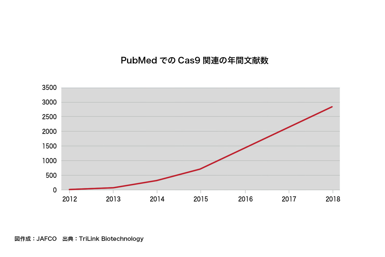指数関数的な変化は、ビジネスの世界だけではありません。学問の世界でも同じです。上記のグラフはCas9関連(ゲノム編集技術関連)の年間文献数です。2012年の論文数はわずか1本でしたが、今では年間3000以上の論文が書かれています。2012年時点でここまでの急激な増加を見込めた人は多くなかったのではないでしょうか。