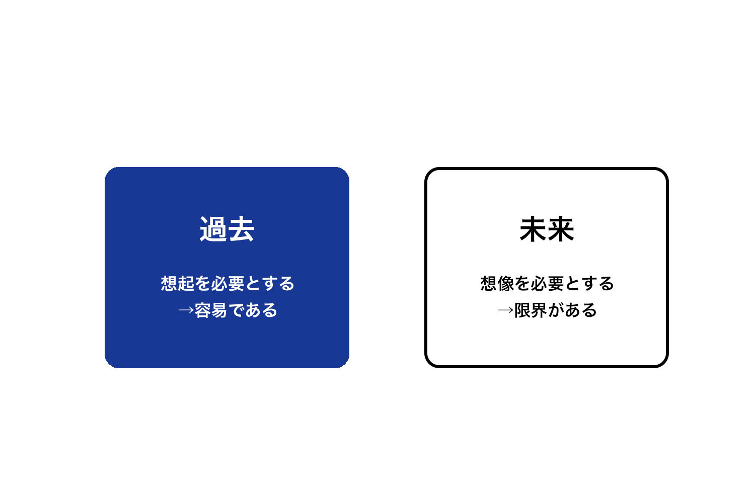 一つは、「未来と過去に対する認識の非対称性」です。ハーバード大学のダン・ギルバート心理学教授の研究では、「人は未来と過去に対する認識の非対称性がある」とはつまり、「同量・同等の変化でも過去の変化と未来の変化では異なった認識を得る」ということを発見しました。過去を振り返るには記憶を「想起」すればいいだけですが、未来を思い浮かべるのには「想像」が必要になります。 想像することは大変難しいことであり、急激な変化の先にある未来を想像するのはより困難です。このような心理的バイアスがかかり、我々は未来の変化を過小評価してしまうのです。
