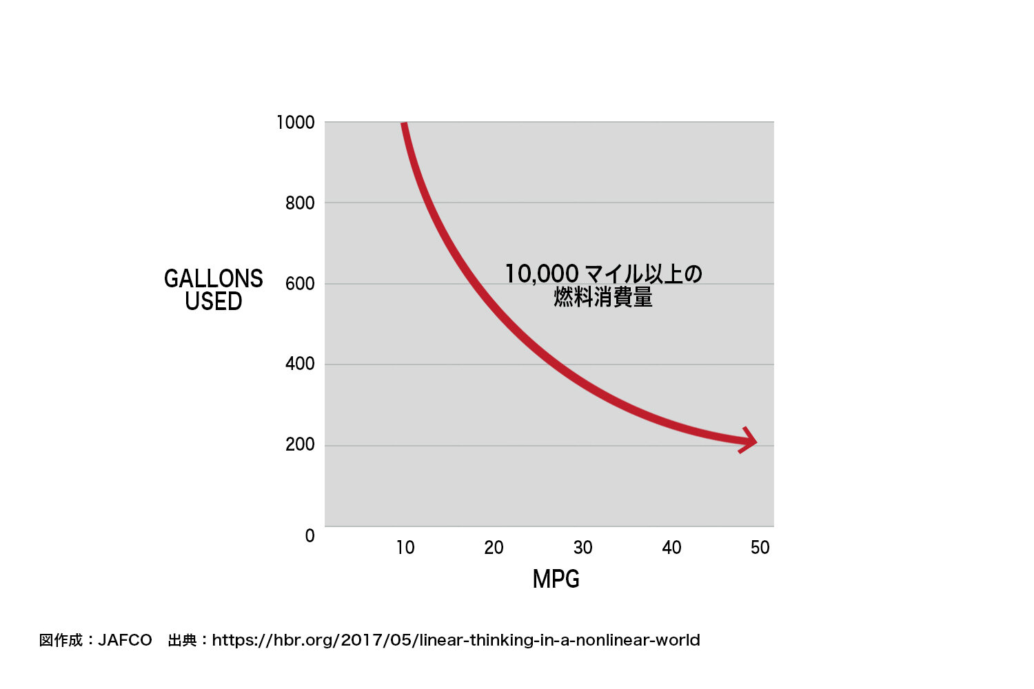 このような線形のグラフを思い浮かべた方が多かったと思いますが、実際に数学で解いてみると、燃費と消費量は実は指数関数的な関係性なのです。つまり以下の図のような関係性になります。