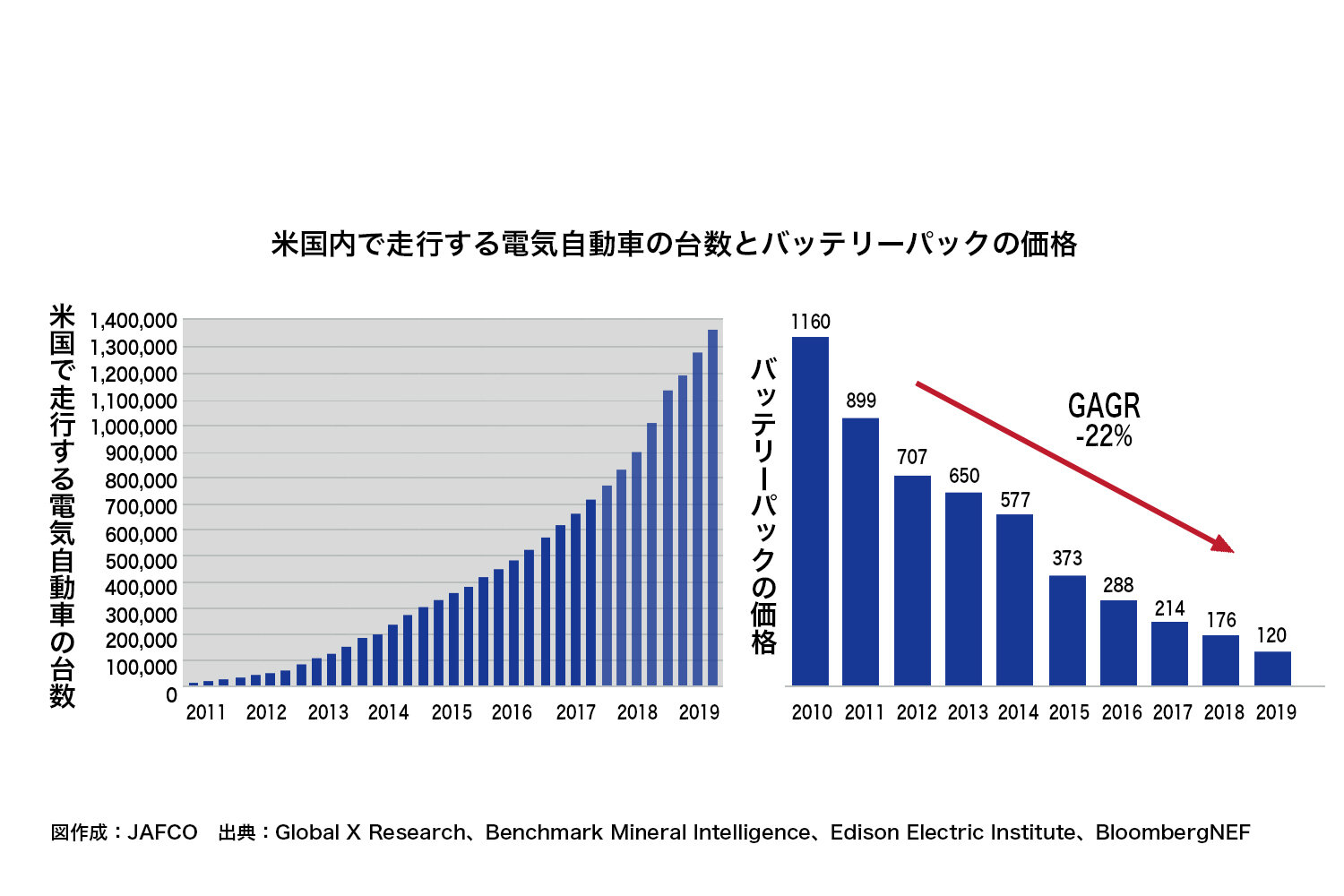 こちらは直近10年間における米国内で走行している電気自動車の台数とバッテリーパックの価格です。台数に関しては指数関数的な変化が見られます。