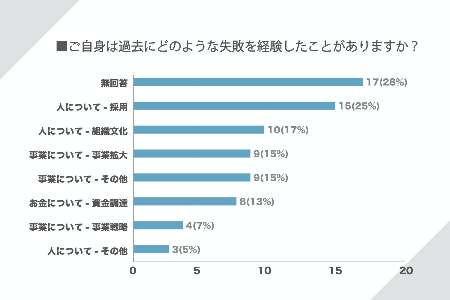 「採用」に関する失敗が15件(25%)と最も多い結果となりました。回答例をご紹介すると、・採用した人が、組織のコミュニティーに与える悪影響を見積もれなかった・人→事業→お金の順番に、連鎖してうまくいかなくなった・採用すべき人でない人を採用した/抜擢すべき人材を抜擢しなかった等といったものがありました。