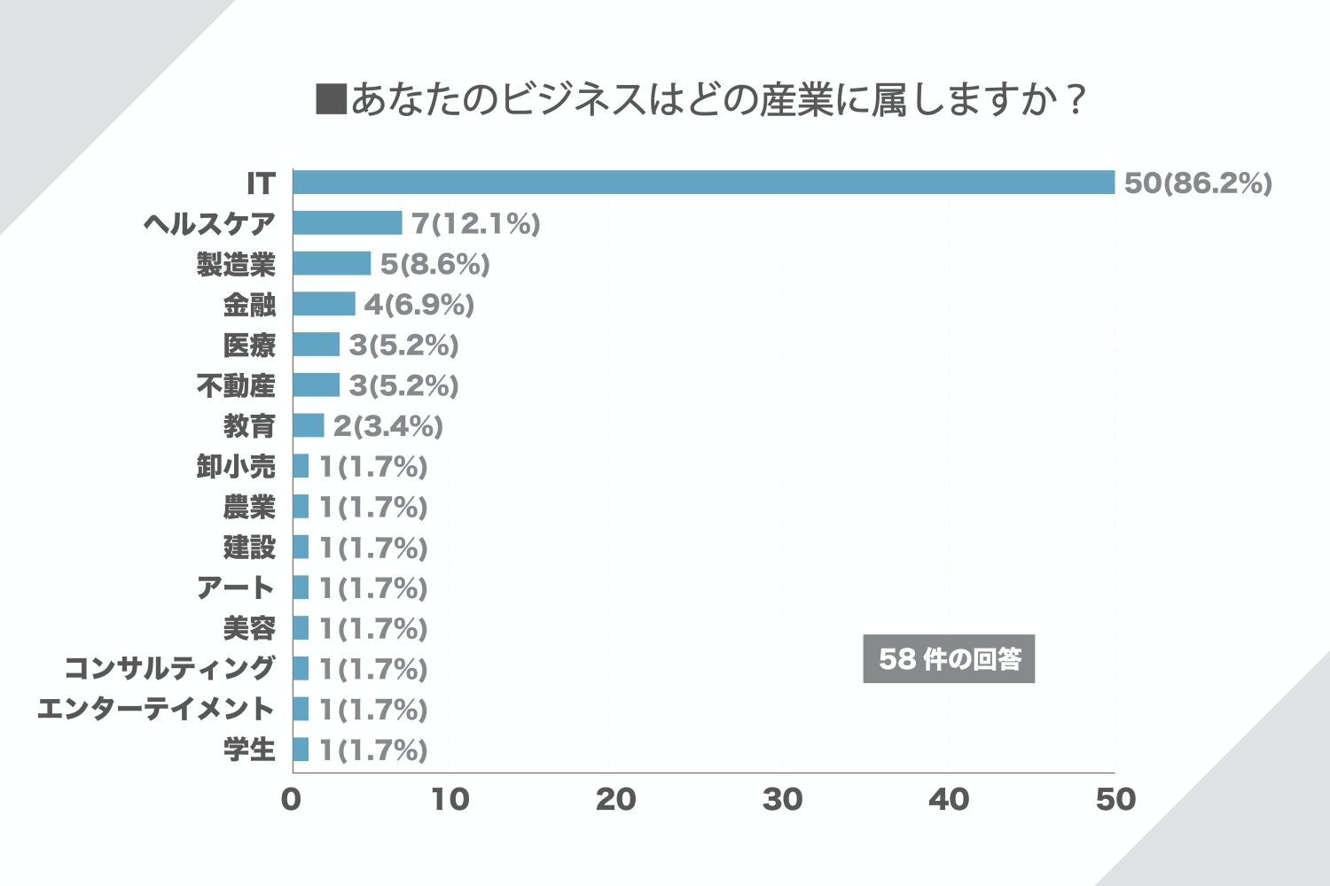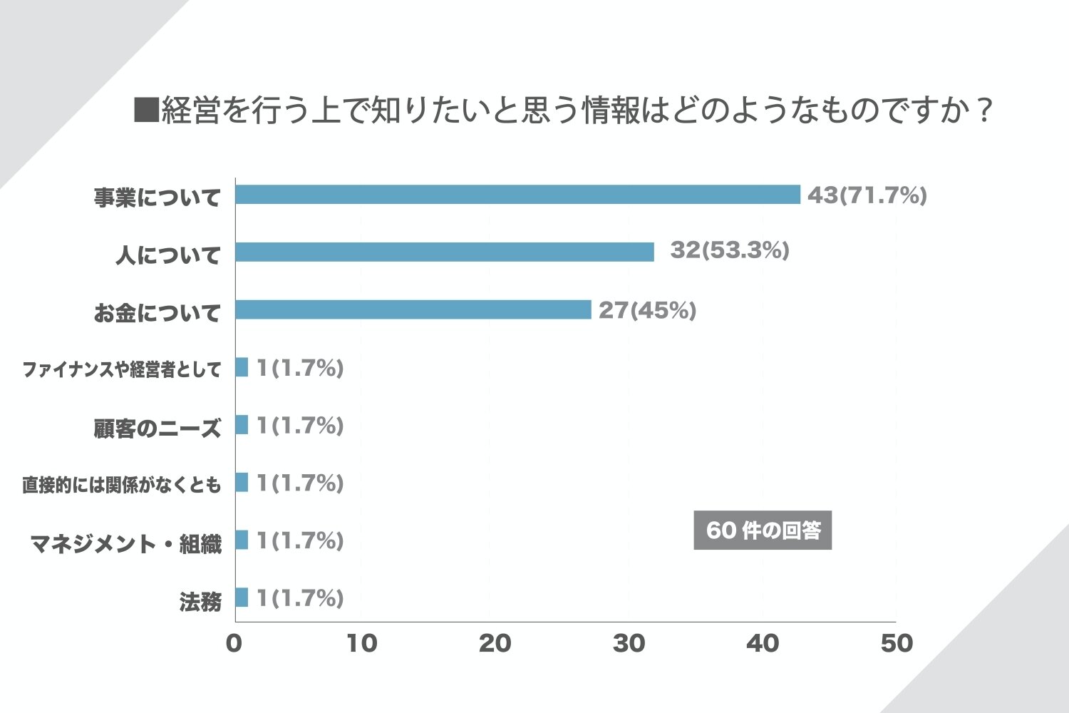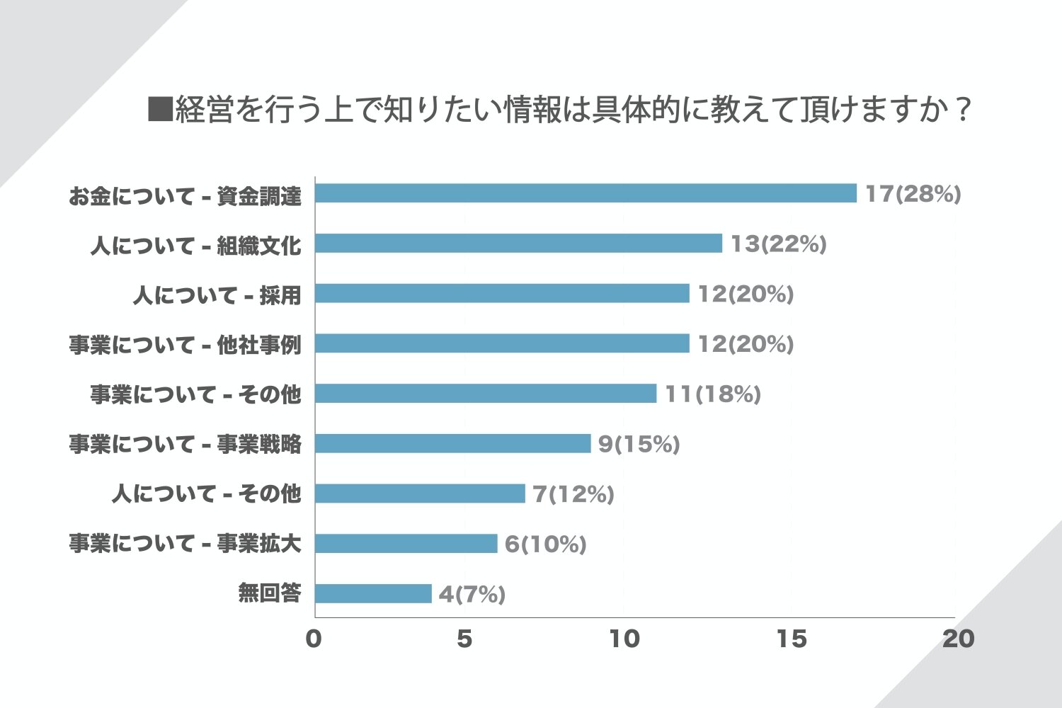 また、それぞれ具体的にどのような情報を求めているのかを聞いてみると、「資金調達」が1位で17件(28%)。2番目に多かったのが、「組織」で13件(22%)。ついで「採用」と「他社事例」が12件(20%)と同数3位となりました。ジャフコの実施するアンケートということで、偏りが出てしまってるのかもしれませんが、起業家にとって、事業を継続・成長させていくための「資金調達」が最重要事項であり、それを実行している「人と組織」についても悩みを抱えているという結果になりました。
