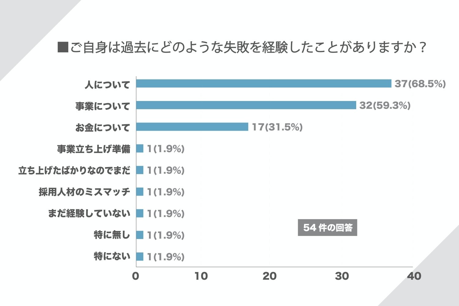 最も多かった失敗は、「人」についてで37件(68.5%)。ついで「事業」で32件(59.3%)という結果になりました。より、具体的な項目を見てみましょう。(自由回答)