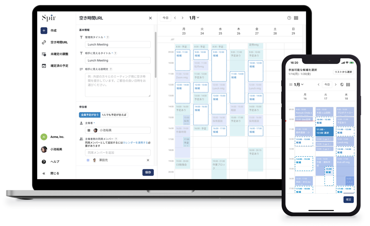 大山 「相手も、自分も、思いどおりの調整を。」をコンセプトに、日程調整ビジネスカレンダー『Spir(スピア)』を運営しています。昨今、複数の組織やプロジェクトに所属する働き方が増えていますが、『Spir』はそれぞれで使っているカレンダーツールを統合して予定を管理することができます。また、従来の日程調整ツールは、カレンダー上のデータから空き時間を抽出して調整する形が多いのですが、実際に日程調整する際は「案件の優先度に応じて調整したい」「大事な予定の前後はできるだけ入れたくない」等の細かなニーズがありますよね。そうしたことも踏まえて戦略的に調整でき、さらにリモート会議URLの自動設定まで一気通貫で行えます。