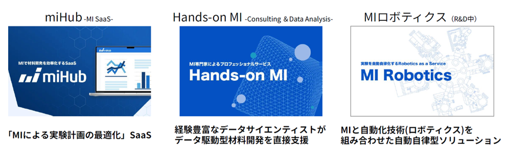 素材・化学メーカーを中心に、データサイエンスによって材料開発を加速する技術(マテリアルズ・インフォマティクス:以下MI)を活用したSaaS「miHub」、ハンズオン型の解析支援サービス「Hands-on MI」並びに自動化技術をMIと組み合わせた実験自動自律化サービス「MI Robotics」の開発と提供を行っている。取引社数は累計100社を突破。累計資金調達額は約15億円(2023年7月時点)