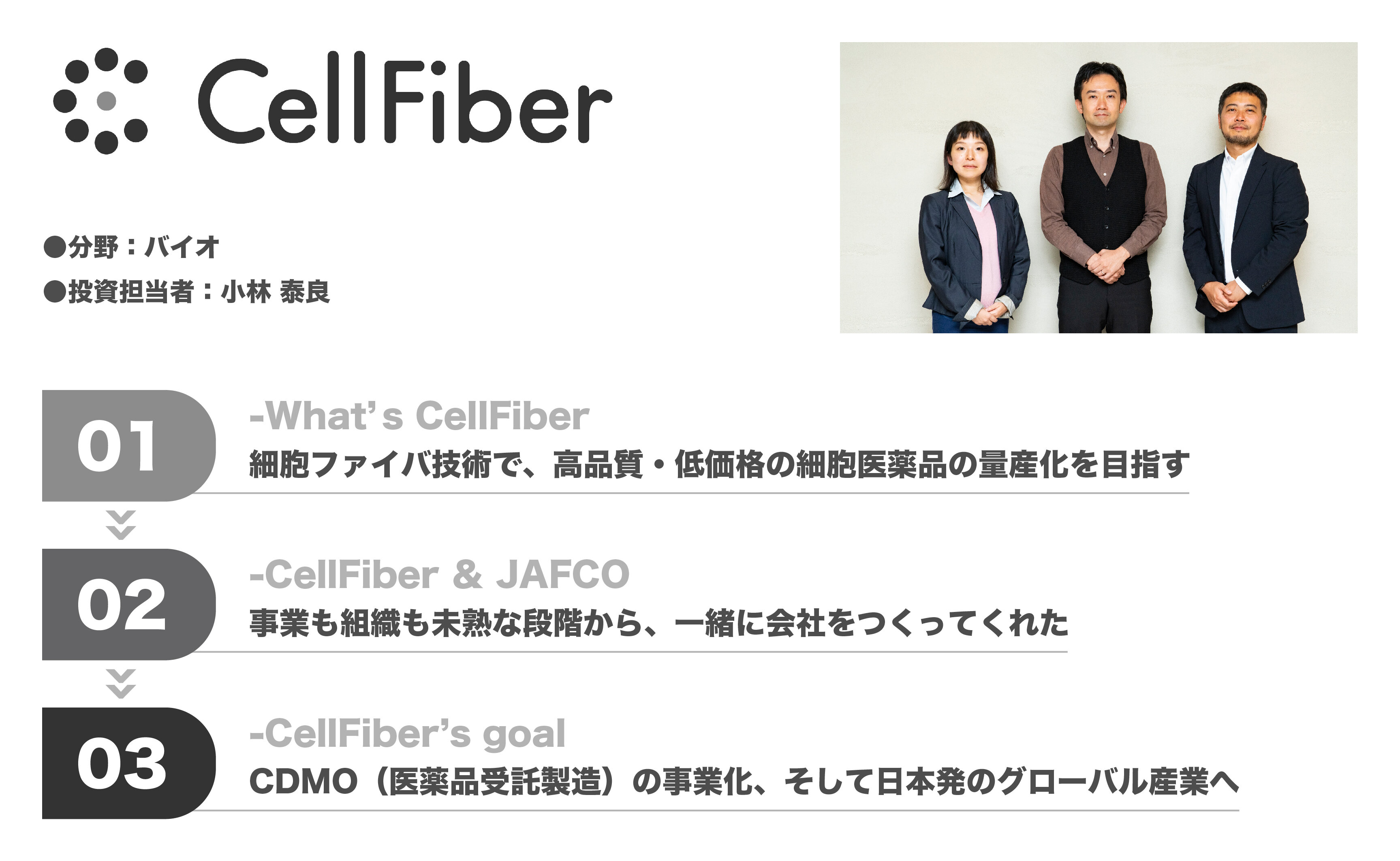 第44回は、株式会社セルファイバ 代表取締役社長の柳沢佑氏、創業者で代表取締役の安達亜希氏に登場いただき、担当キャピタリスト小林泰良からの視点と共に、これからの事業の挑戦について話を伺いました。