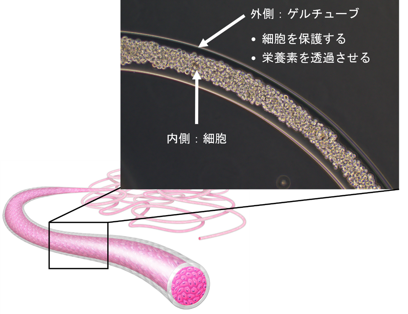 安達 海藻由来のハイドロゲルでできた、髪の毛ほどの細さのチューブの中に細胞を封入し、その中で細胞を培養する技術です。従来の培養法で量産しようとすると、細胞が様々なダメージを受けて品質が低下してしまうのですが、細胞ファイバを用いれば品質を保ちながら従来の10倍のスケールで量産することができます。「果物を保護するネット」や「台風から人を守る家」のようなイメージです。