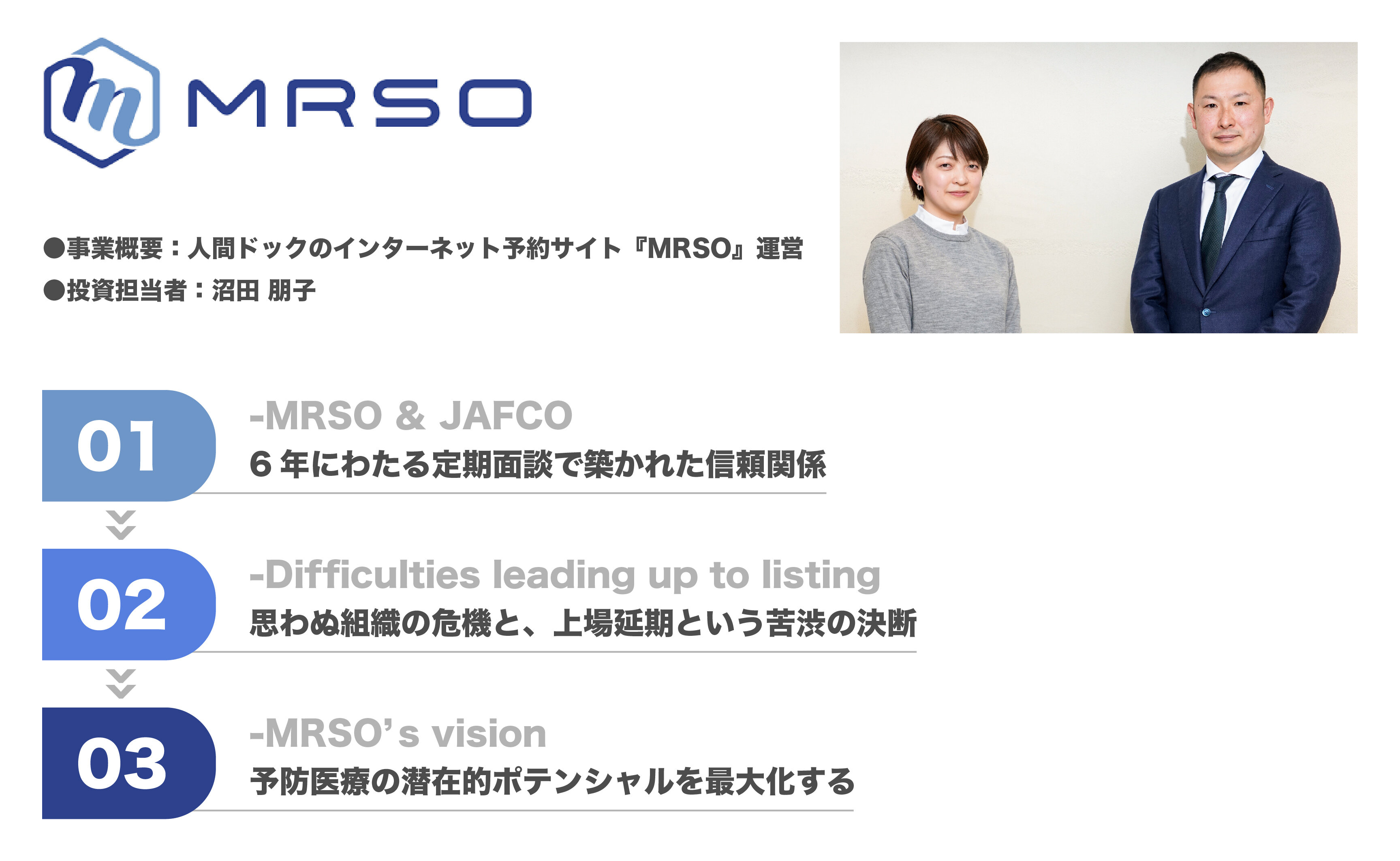 起業家とジャフコの出会いから上場までの軌跡を紐解く「IPO STORY」。見事に上場を掴み取った起業家の今だから語れるエピソードや想い、これからへの展望を語ります。今回は、2023年12月に東証グロース市場に上場したマーソ株式会社 代表取締役社長 西野恒五郎氏と、ジャフコ担当チーフキャピタリストの沼田朋子による対談をお届けします。