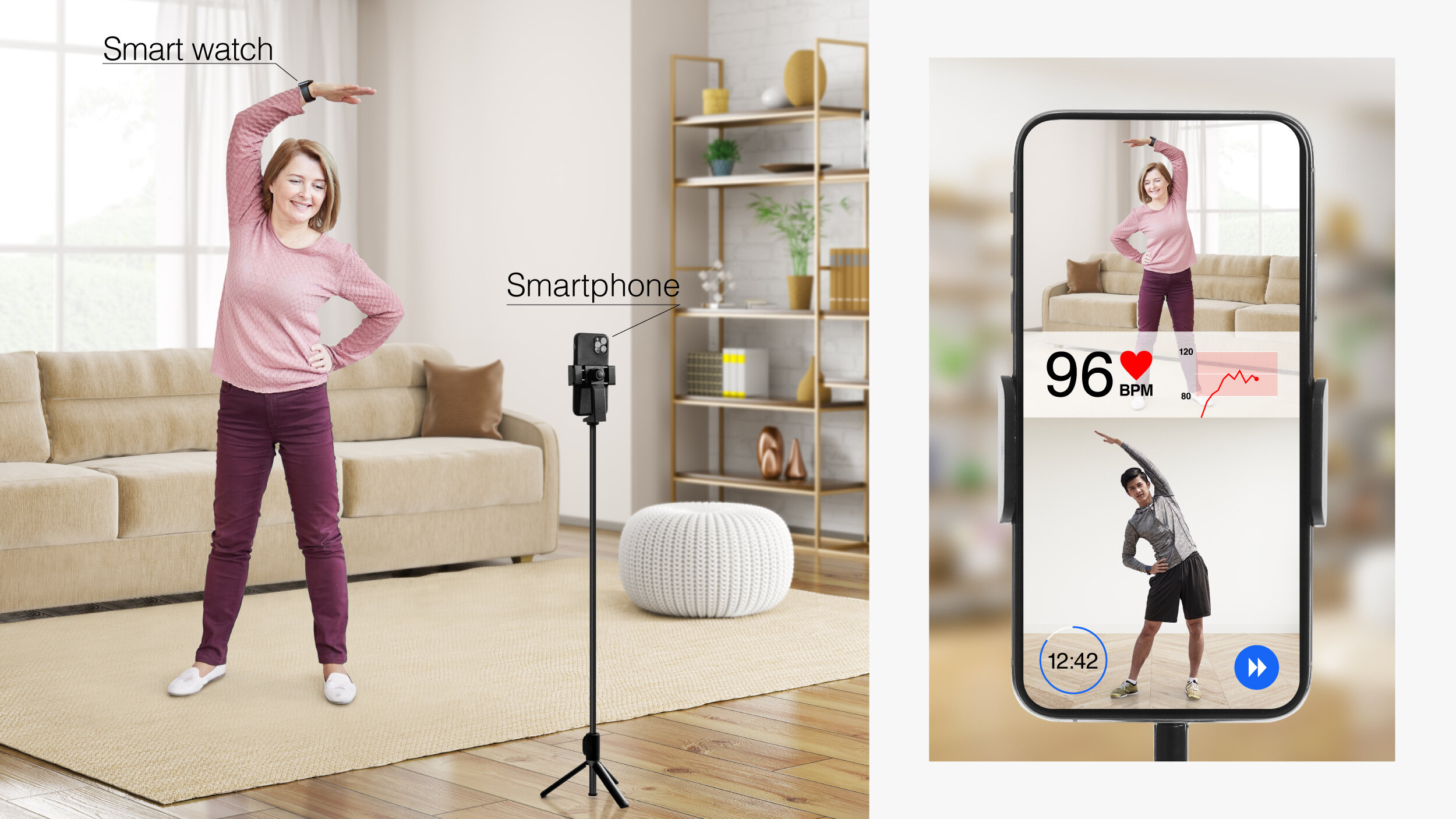 これらの問題点を全て解決したのが、私たちが開発する「遠隔心臓リハビリシステム」です。CaTeでは、患者さんがエルゴメーターなどの器具を使わず、立ったままの運動でも、運動負荷量を一定かつ最適にできるシステムを構築した点が、他にはない強みとなっているのです。