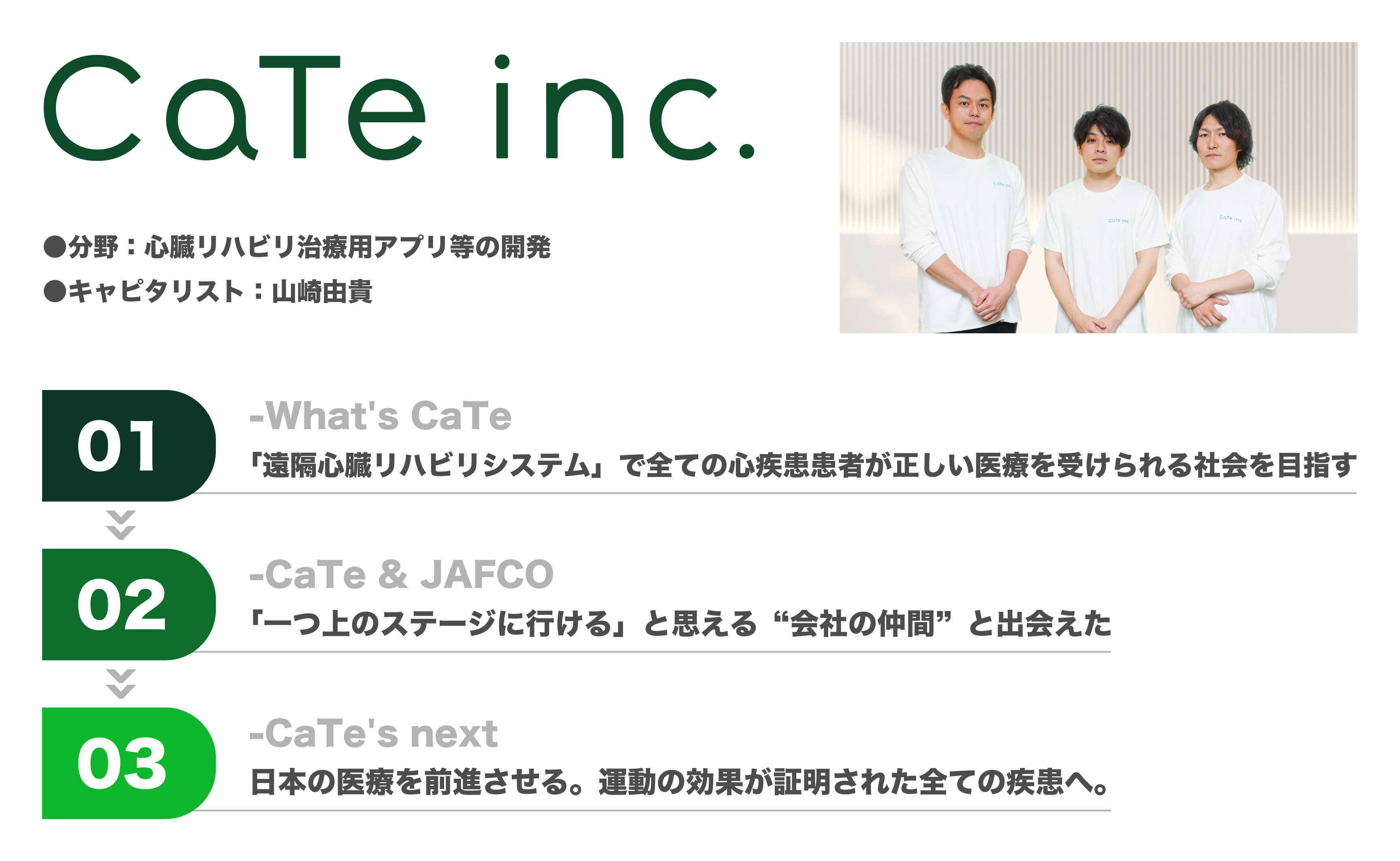 超高齢化社会において心疾患患者は増加傾向にありますが、仕事や家庭の事情による通院負担などの理由から、外来心臓リハビリへの参加率が低いことが課題です。この課題に対し、CaTeは、汎用的なデバイスのみで、医者の非監視下で、安全に運動療法を実施可能な心リハ治療用アプリの開発を行っています。また、将来的には運動療法の効果が証明されている他疾患のパイプラインを見据えており、国内のDTx市場を牽引する会社になると信じています。DTxの開発には事業ステージによって多様なスキルが求められますが、寺嶋さんの求心力と推進力で強いチームへと着実に拡大してきています。CaTeとともに、10年後の日本の医療を大きく前進させるべく、全力で併走して参ります。