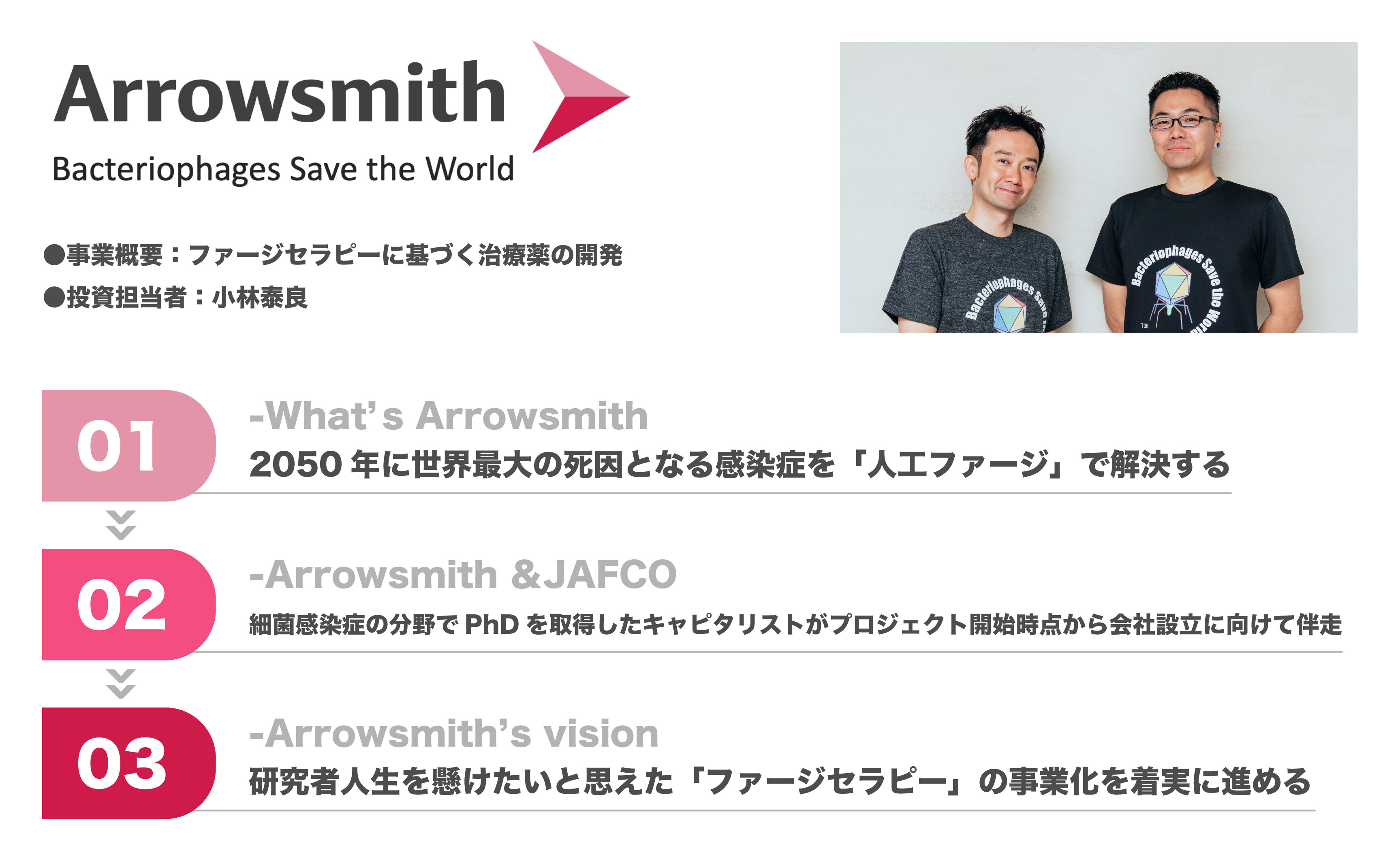 20世紀の人類最大の発見の一つ、抗菌薬がもたらした乳児死亡率の減少と平均寿命の伸長は現代の人類繁栄の礎となり、特に本邦は優れた公衆衛生環境の寄与もあり細菌感染症は過去のものとして扱われることも少なくありません。一方、海外を中心に安易な抗菌薬乱用などがもたらした多剤耐性菌の出現が多数報告され、WHOも警鐘を鳴らす中で、グローバルな世界に身を置く本邦でもすでに看過できない問題となっています。Arrowsmithはすでに細菌感染症治療薬の開発プロジェクトとしてAMEDの創薬ベンチャーエコシステム強化事業に採択され、本邦の公衆衛生や国防の観点から大きな期待を寄せられています。何より未来の世界中の子供たちを感染症から守る治療手段を確立するため、これまで会社設立に向けて伴走した以上に気を引き締めてジャフコとして最大限支援をしていく所存です。