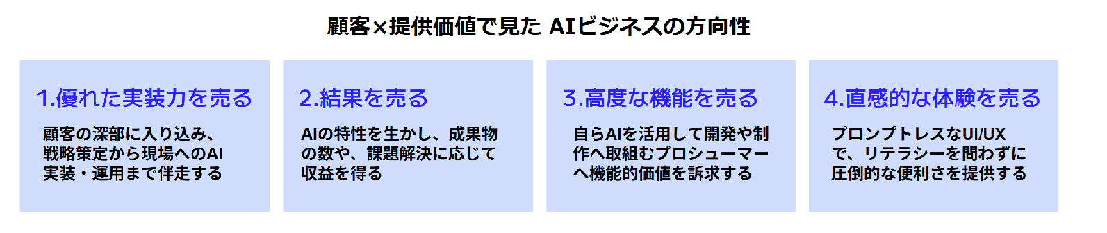 本レポートでは、海外の先進事例をもとに、Post PoC時代におけるAIビジネスの方向性として、以下の4つの戦略を仮説として提示しています。あわせて、日本市場において各モデルを展開する際に求められるケイパビリティ(組織能力)や、事業設計上の論点を整理しています。