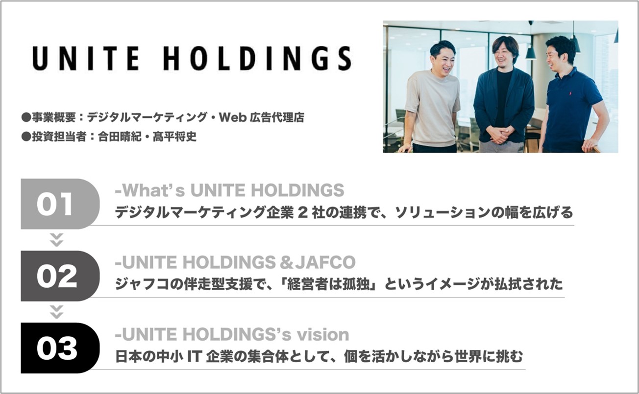 第3回は、ユナイト・ホールディングス株式会社 代表取締役CEOの芳賀一生氏に登場いただき、投資担当者の合田晴紀・髙平将史からの視点と共に、これからの事業の挑戦について話を伺いました。