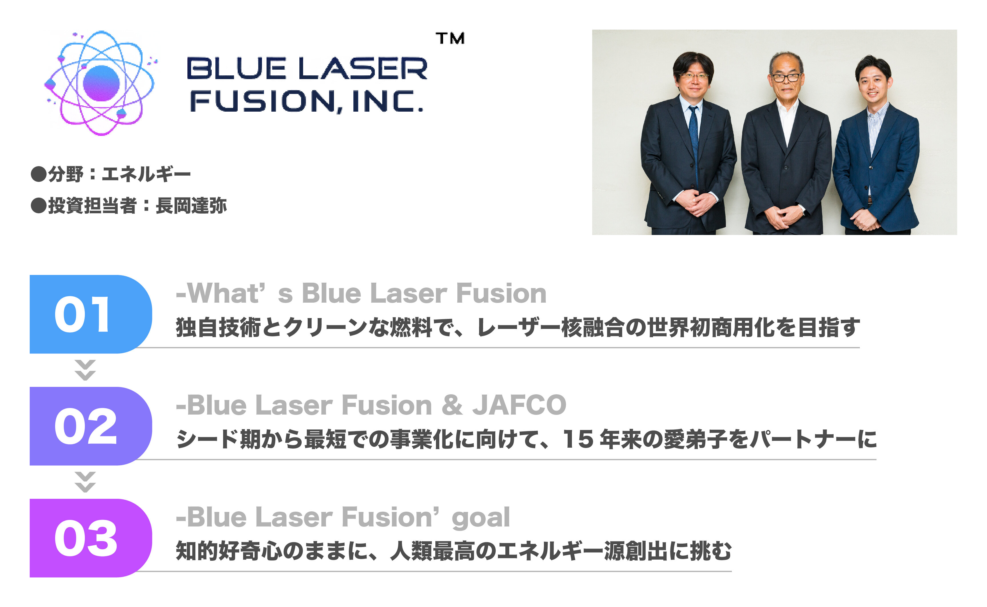 In our 43rd installment, we interviewed Hiroaki Ohta who co-founded Blue Laser Fusion, Inc. with 2014 Nobel laureate in physics Shuji Nakamura. Together with Tatsuya Nagaoka, JAFCO's capitalist in charge, we discussed the challenges of their future business endeavors.