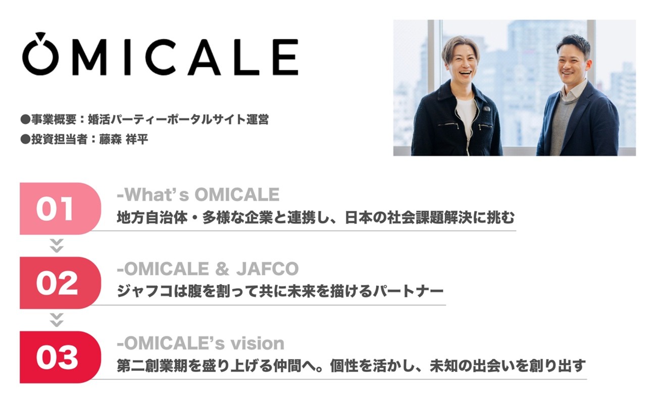 Omicale’s vision, “Turning zero encounters into ZERO,” reflects the idea of expanding the very opportunities for people to meet, not limited to encounters premised on marriage. Omicale values creating opportunities for encounters while supporting not only those seeking serious relationships but also those who simply want to participate casually at first. As ways of meeting diversify, we strongly resonate with Omicale’s commitment to continually evolving marriage matchmaking events in step with the times. Together with President Kurumiya and the team, we will continue to support Omicale’s challenges going forward.
