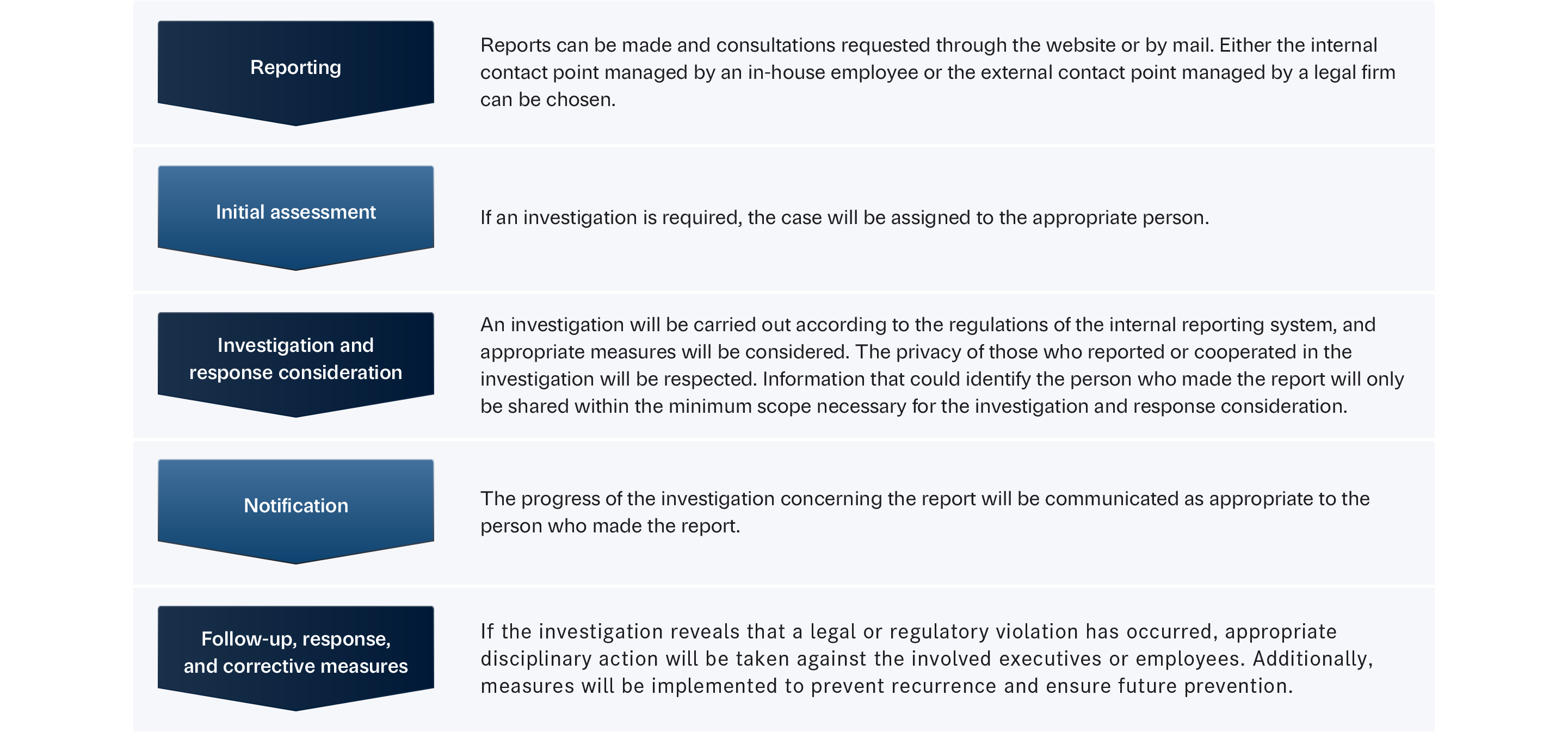 An internal reporting hotline has been established and is operated as a means for officers, employees, and others at the Company Group to directly provide information to the Company regarding conduct that is in violation of, or risks violating, laws and regulations.