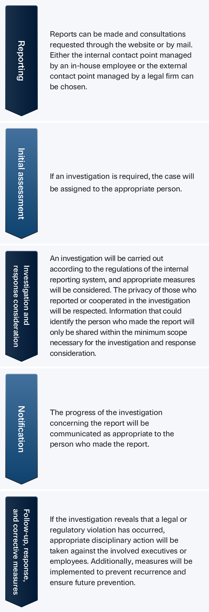 Confidentiality and the protection of the privacy of those who report are strictly upheld, and retaliation or any unfavorable treatment against those who report are prohibited.