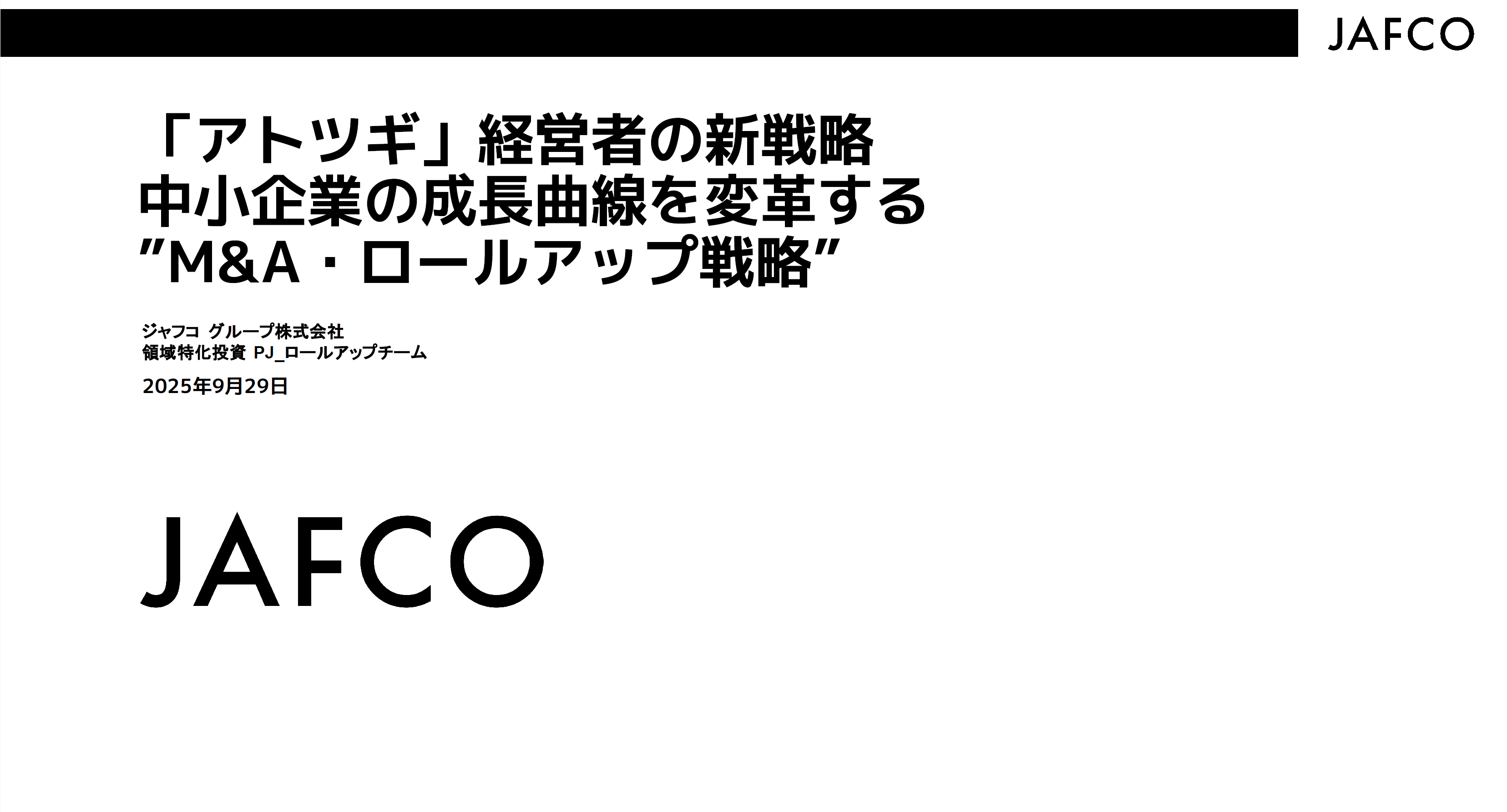 本資料では、「アトツギ」経営者の皆様に向けて、エクイティファイナンスを活用したM&A・ロールアップ戦略による事業成長の可能性と、その具体的な成功事例を解説しています。事業のさらなる発展を検討される際の参考情報として、本資料が皆様の検討の一助となれば幸いです。ぜひご一読ください。