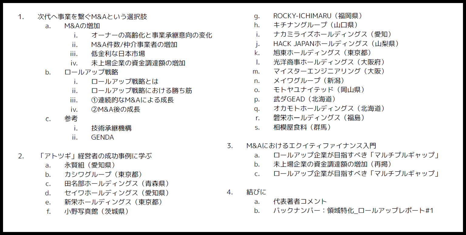 中小企業の事業承継という社会課題を背景に、「アトツギ」経営者がM&A・ロールアップ戦略を活用して成長曲線を変革する可能性について考察しています。具体的には、M&Aが増加する市場背景を分析し、ロールアップ戦略の勝ち筋を体系的に整理しています。また、ロールアップ戦略を実践する19社の「アトツギ」経営者の成功事例を紹介。さらに、成長を加速させるためのエクイティファイナンスの活用や、企業価値を高めるマルチプルギャップの実現についても解説しています。
