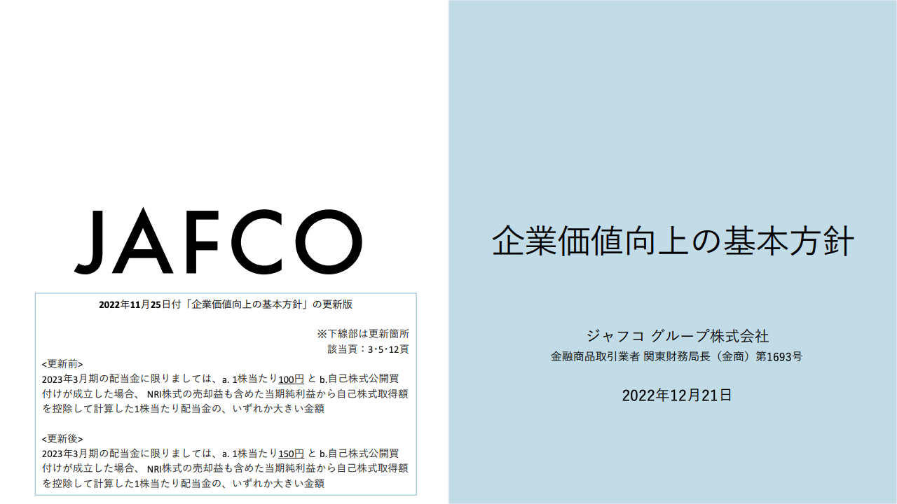 2022年12月21日開示の企業価値向上の基本方針について、一部内容の更新を行っています。合わせて進捗状況のご報告を行っています。なお、進捗状況については、四半期ごとに決算説明資料において情報アップデートを行っています。詳細はIRライブラリ内、「決算短信・決算説明資料」ページをご参照ください。