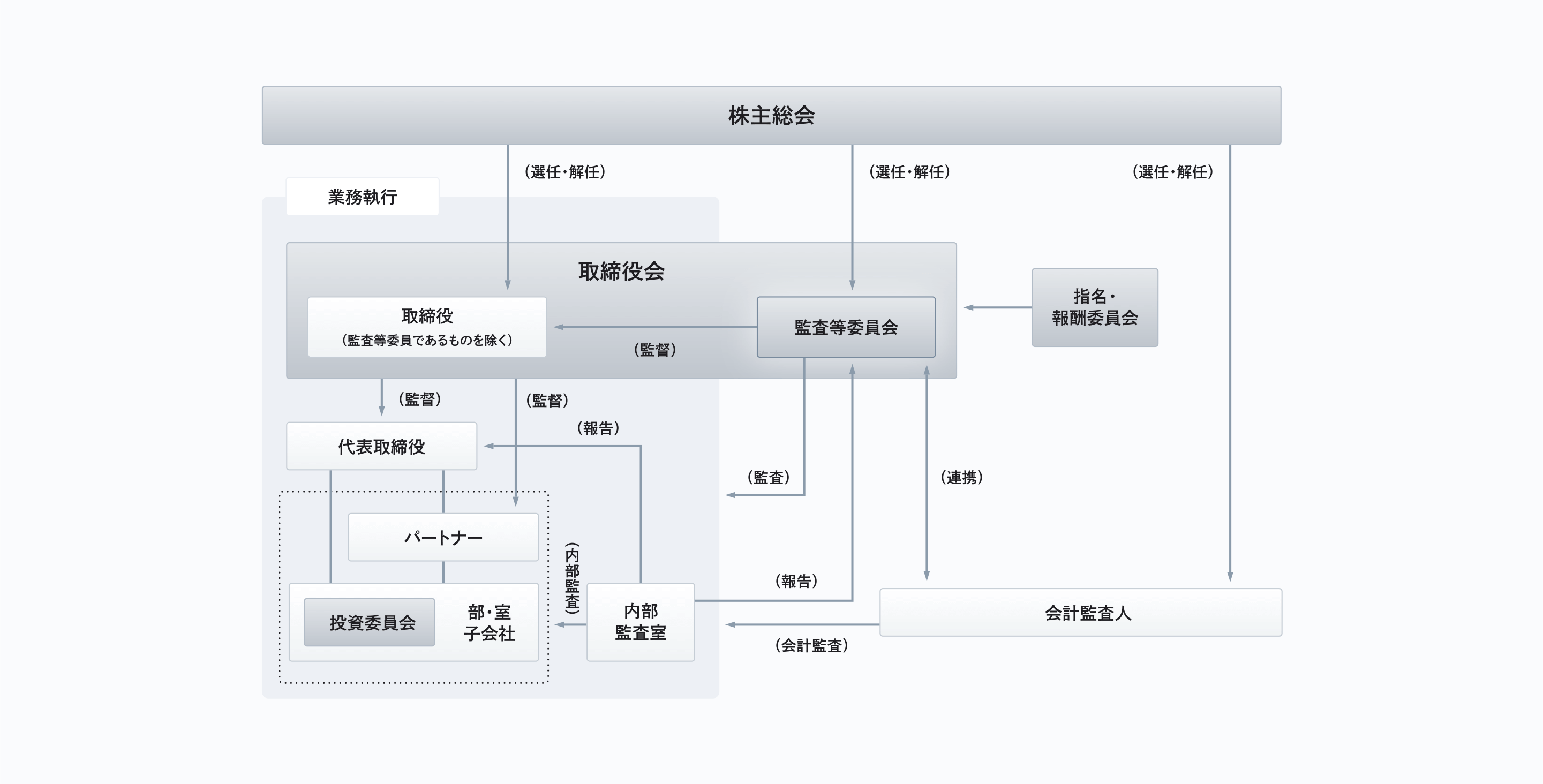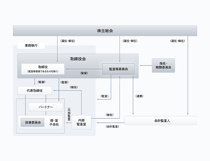 投資案件の判断は、迅速な意思決定を行うため、取締役社長やパートナー等で構成される投資委員会が行っています。投資委員会には、監査等委員である取締役も随時参加しています。